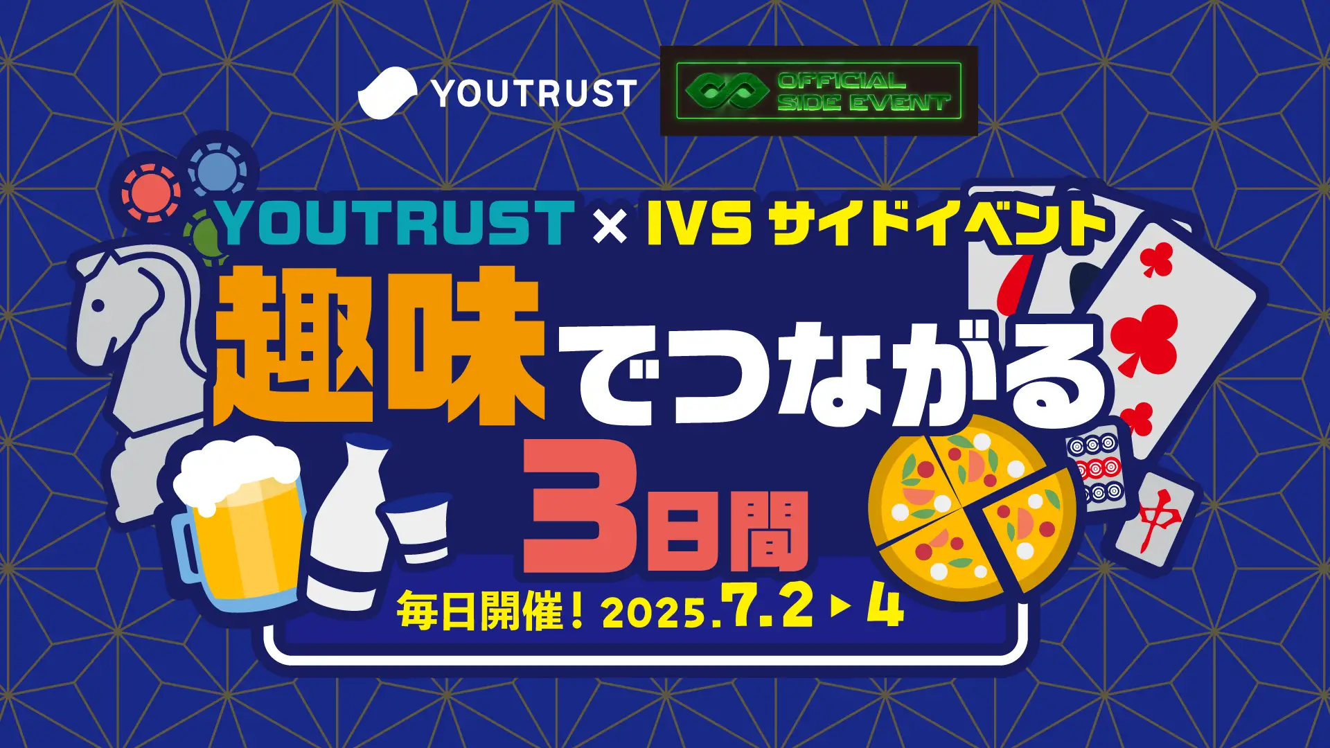 株式会社YOUTRUSTは、日本最大級のスタートアップカンファレンス「IVS2025」にブース出展と合わせ、2025年7月2日(水)〜4日(金)イベント期間中、全10種類の趣味でつながる公認サイドイベントを開催いたします。
